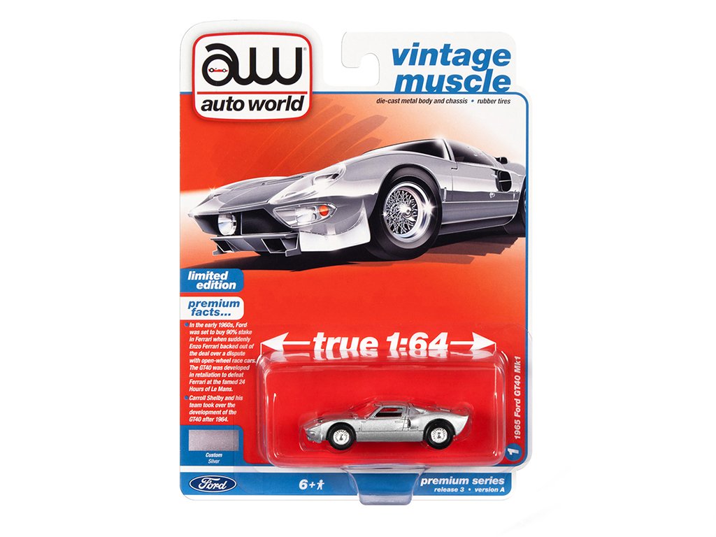 Ford GT40 MK1 1965 šedá 1:64 - Auto World kovový model auta